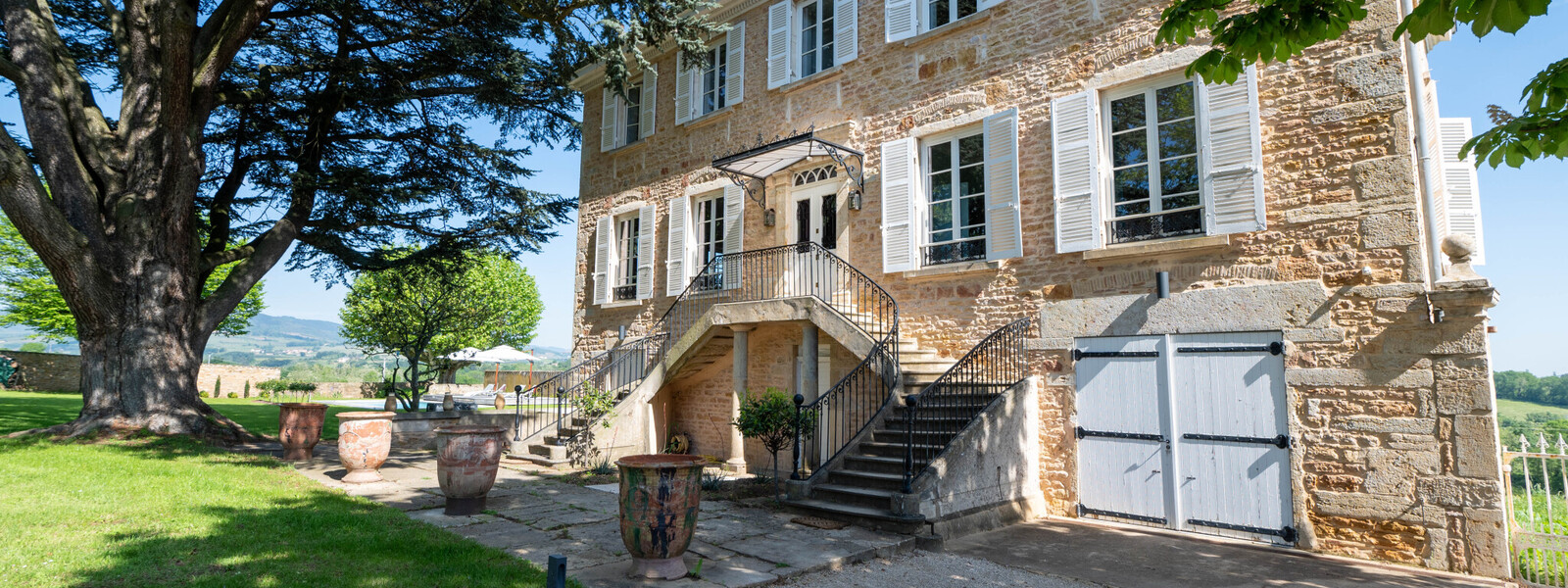 Family property in the Pierres Dorées Beaujolais region for 26 people (spread over 2 houses): 10 bedrooms, 3 kitchens, heated swimming pool in enclosed garden, indoor SPA. Kids friendly. Vineyards at 360°C, unobstructed view of Mont Blanc!