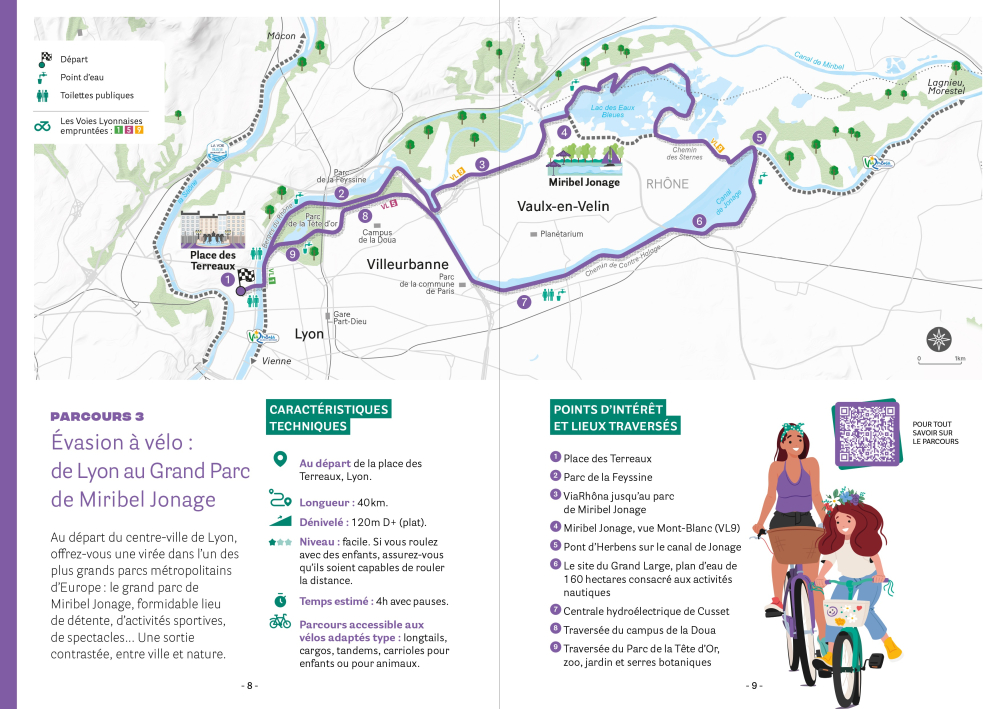 The route will take you to Miribel Jonage, with a view of Mont Blanc (VL9), the bridge of Herbens across Jonage canal, the Réservoir du Grand-Large, a 160-hectare (395-acre) lake dedicated to water sports, the hydroelectric power station of Cusset, and the La Doua campus, before returning to Lyon via the park.